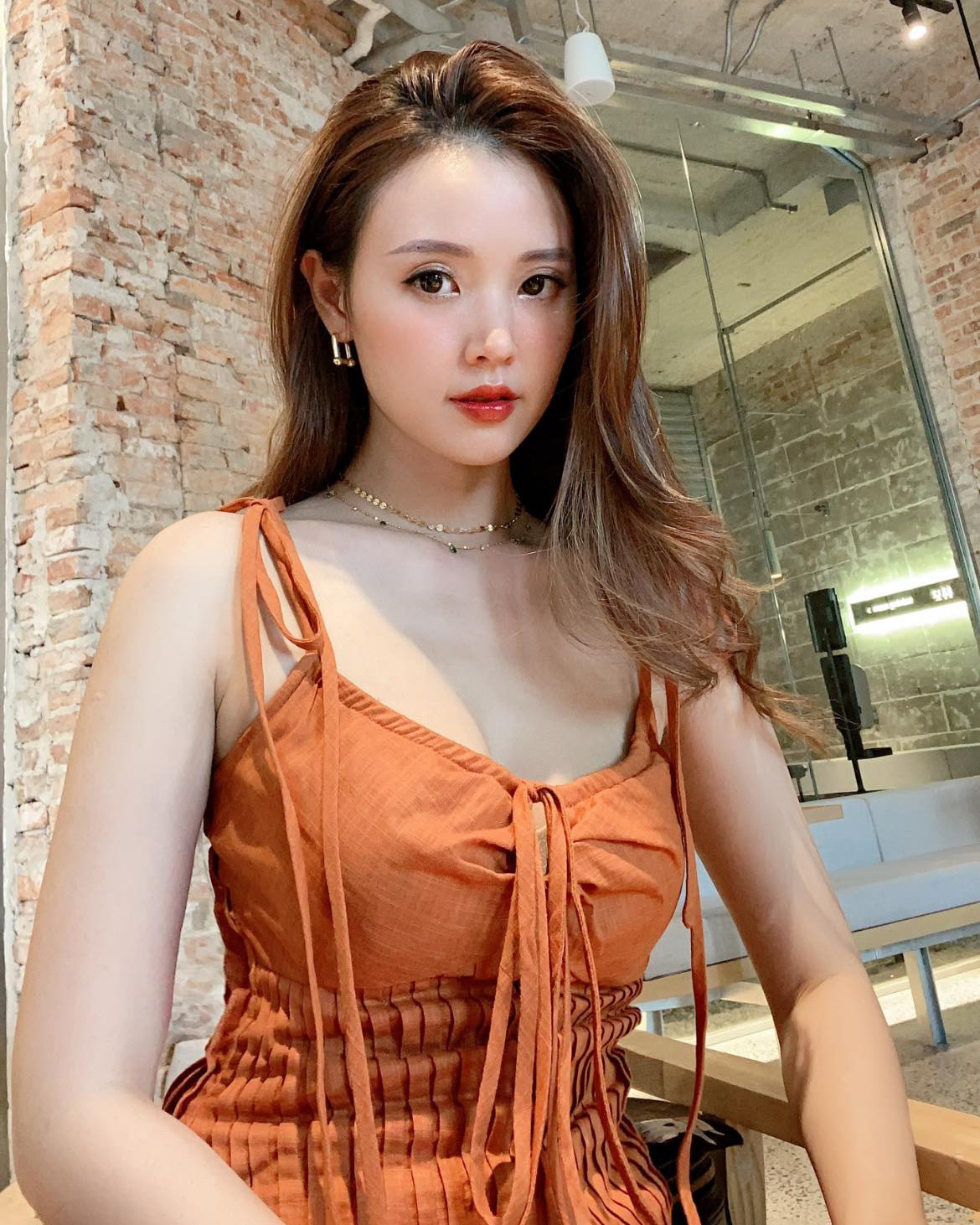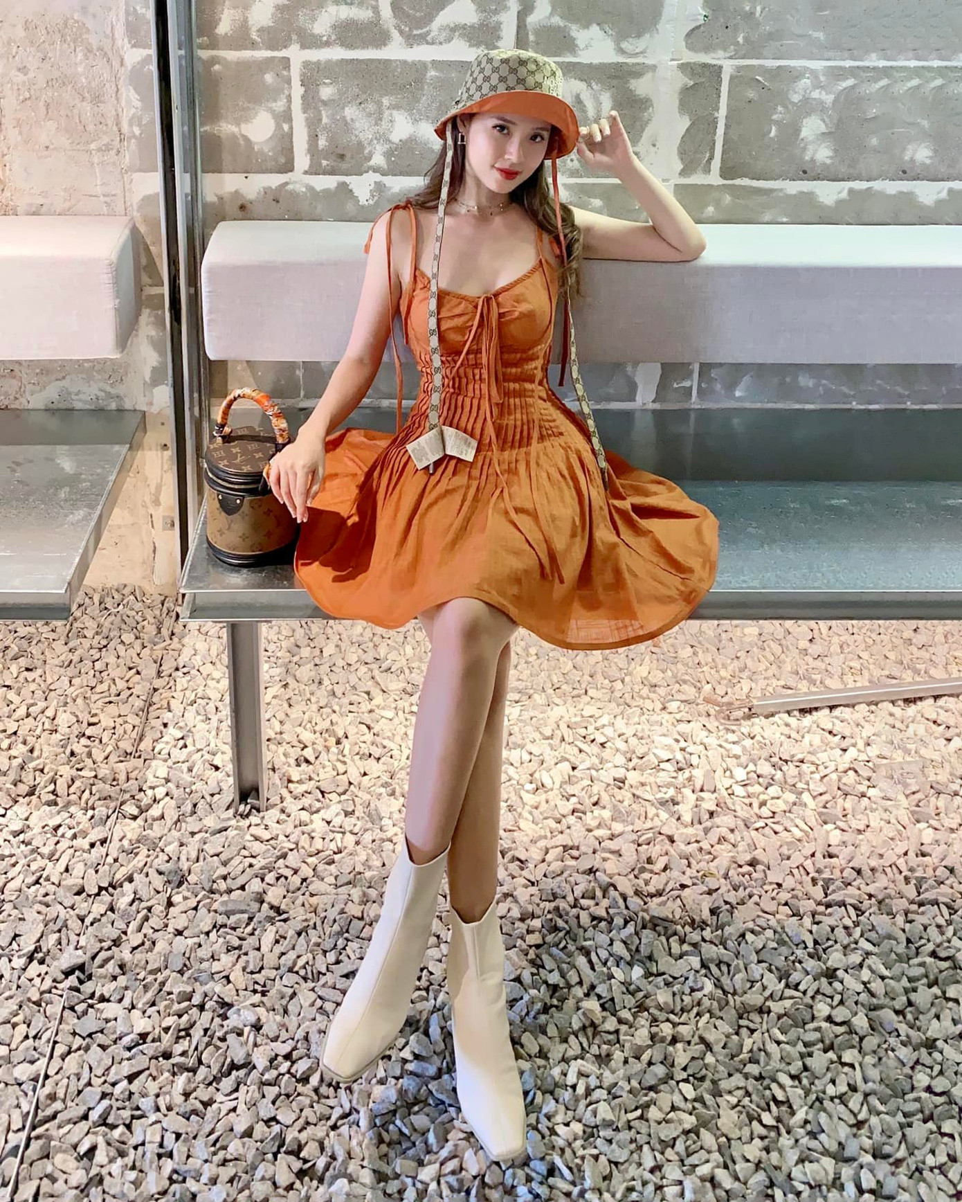 Người hâm mộ nhanh chóng nhận ra Midu đã có một vài lần mặc chiếc váy này khi đi chơi cùng bạn bè. Thiết kế nhún ở phần ngực, ôm ở phần eo giúp Midu khoe trọn được vòng eo bé xíu của mình. Chưa kể màu cam càng tôn lên nước da trắng mịn của cô.