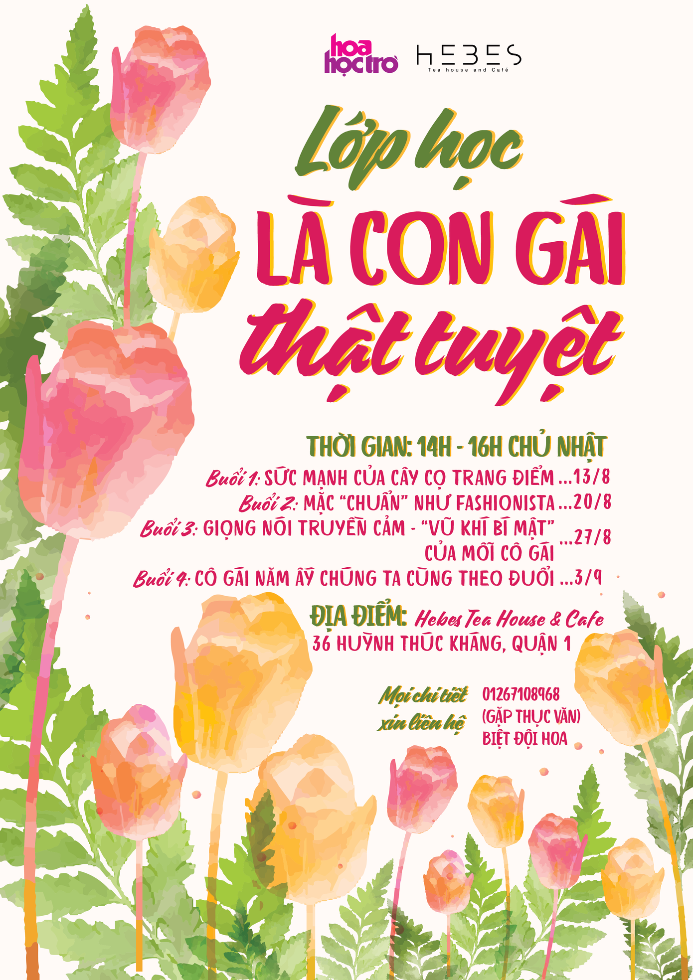 Các buổi học sẽ được lần lượt tổ chức vào Chủ Nhật các ngày 13/8, 20/8, 27/8 và 3/9/2017 vào lúc 14h - 16h tại quán Trà sữa Hebes (36 Huỳnh Thúc Kháng, Quận 1, TP.HCM). Phí học mỗi buổi là 300K. Chỉ có 20 suất duy nhất cho 20 bạn nhanh tay xí chỗ qua đường link: http://bit.ly/workshopHHT2017. Nhanh tay nào!