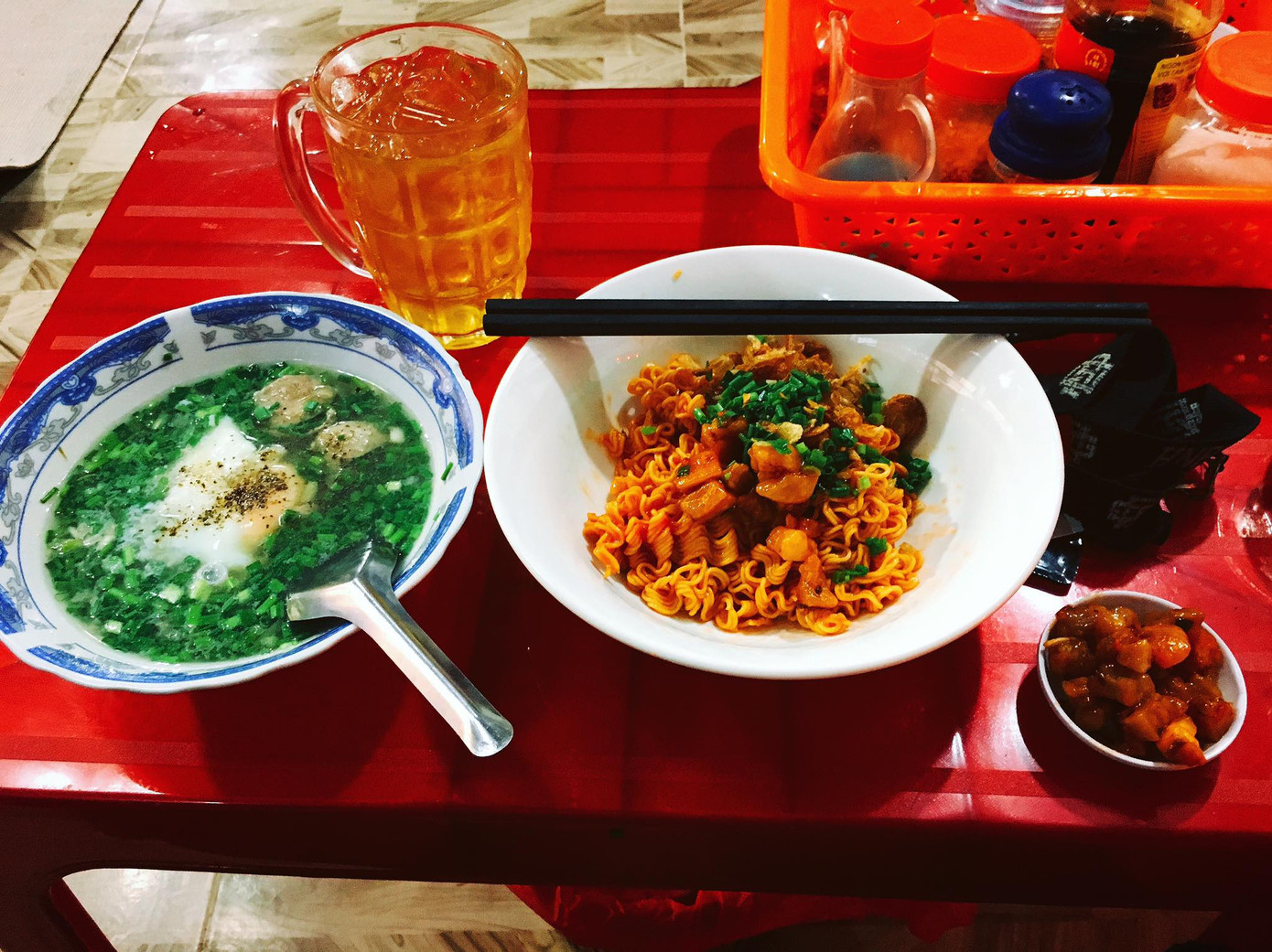 Chưa dừng lại ở đó, chúng còn được áo thêm lớp nước sốt chua ngọt bên ngoài nữa thì thử hỏi làm sao chúng ta không “ngã gục” trước tô mì tuyệt hảo ấy! Trộn đều tay cho nước sốt được thấm đều cả mì lẫn tóp mỡ sau đó thì cầm đũa lên và “feel” thôi. Còn nếu như bạn vẫn chưa thấy “đã” thì tại sao chúng ta không đặt phần trứng lòng đào lên và trộn chung luôn nhỉ? Lúc này thì ôi chao, phần mì mới béo thơm làm sao. Lòng đỏ trứng tuôn chảy hòa quyện cùng nước sốt chua cay sẽ khiến chúng ta gắp không ngơi tay! Đừng quên chén nước dùng tôm, thịt phục vụ kèm! Còn đợi gì nữa mà không lập team “chiến” ngay và luôn thôi!