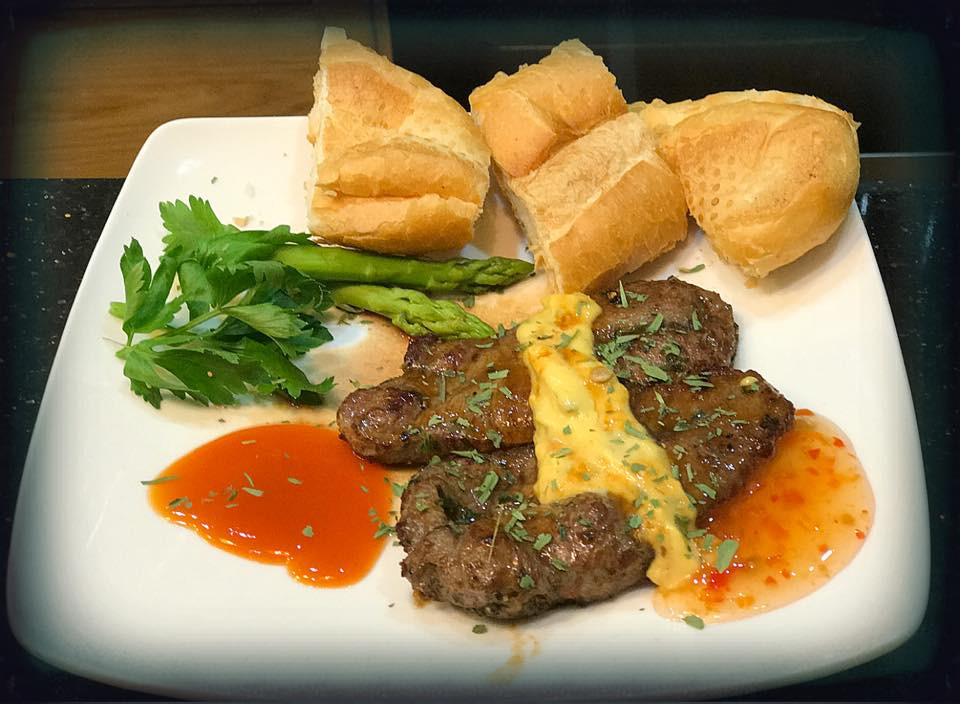 Thịt bò bít tết ăn kèm với bí đỏ nướng hải sản.
