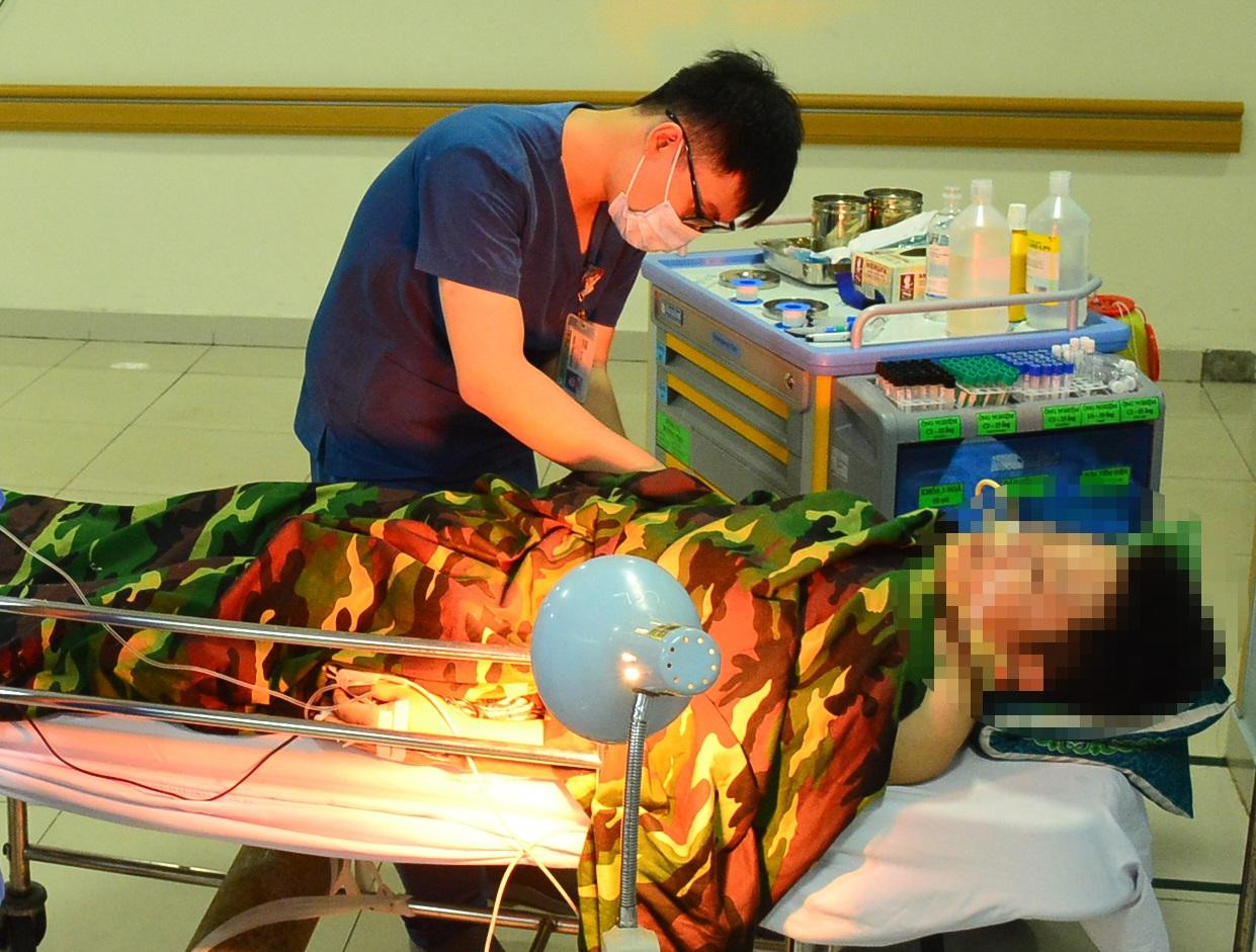 Ngay lập tức, nam quân nhân P được đưa vào khoa Cấp cứu thực hiện các bước kiểm tra, chẩn đoán phục vụ điều trị. Thượng úy, bác sĩ Tạ Văn Bạch người trực tiếp chuyển bệnh nhân từ đảo về đất liền cho biết, bệnh nhân được chẩn đoán sốc mất máu mức độ nặng ở vùng mũi họng sâu.