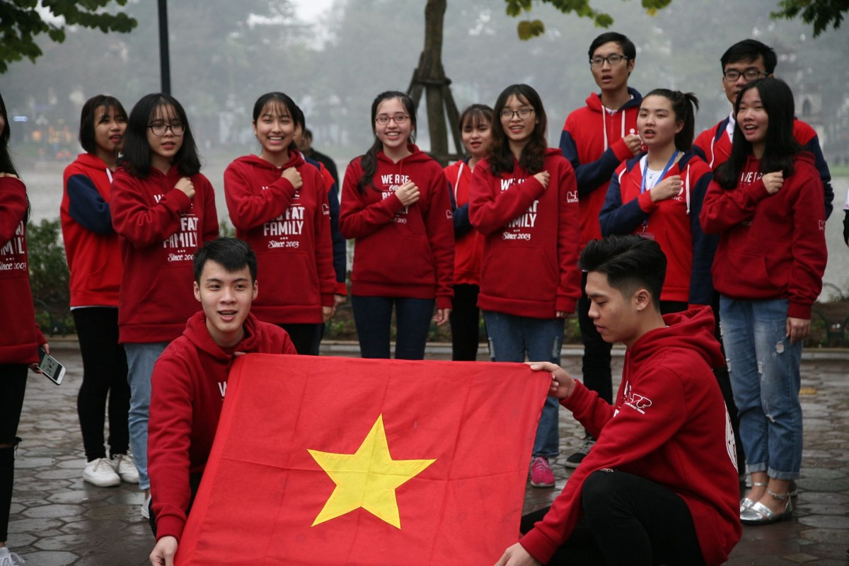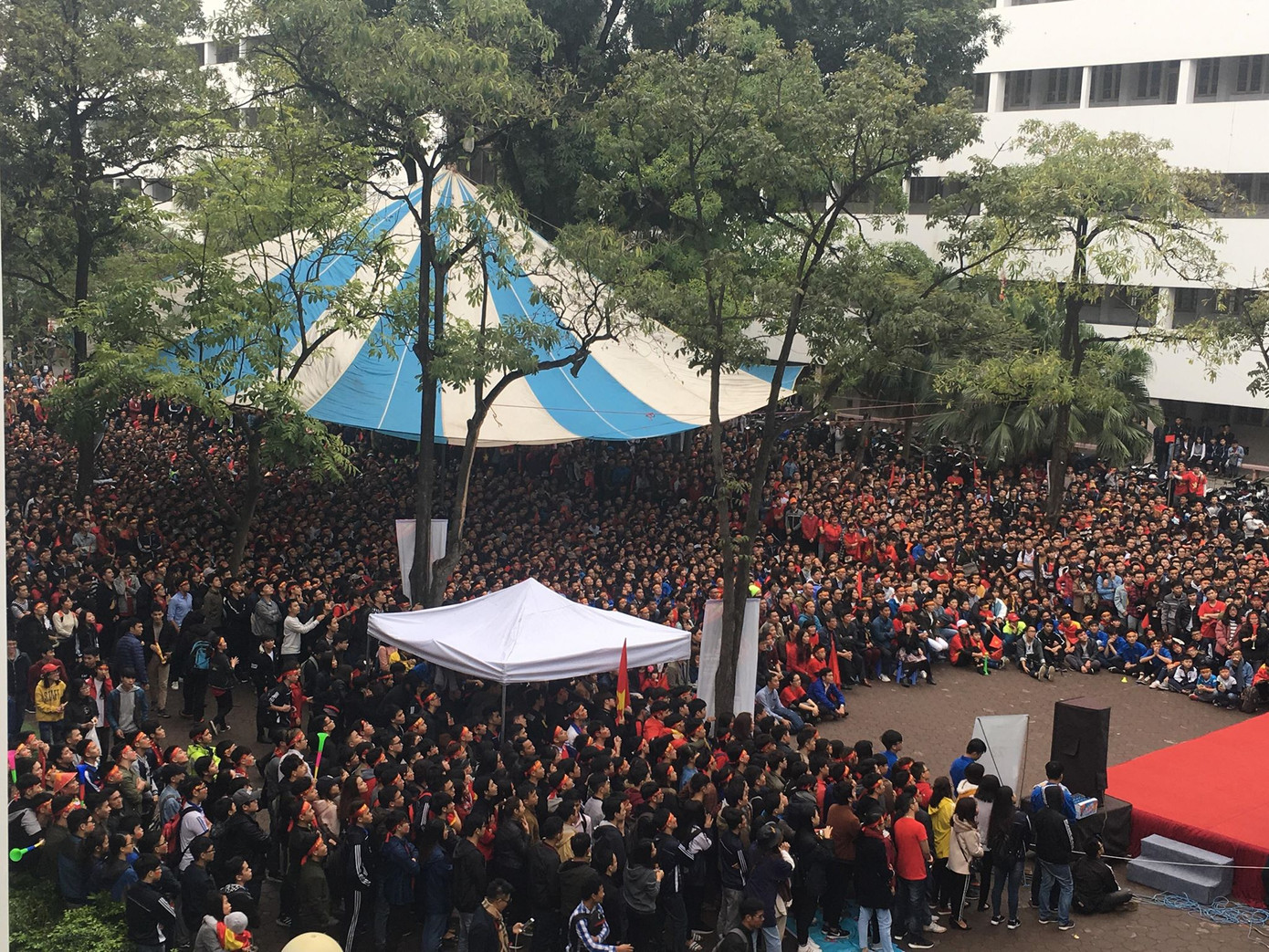 Tại trường Đại học Xây dựng (Hà Nội), các bạn sinh viên tập trung rất đông từ sớm để đón chờ xem trực tiếp trận chung kết lịch sử này.