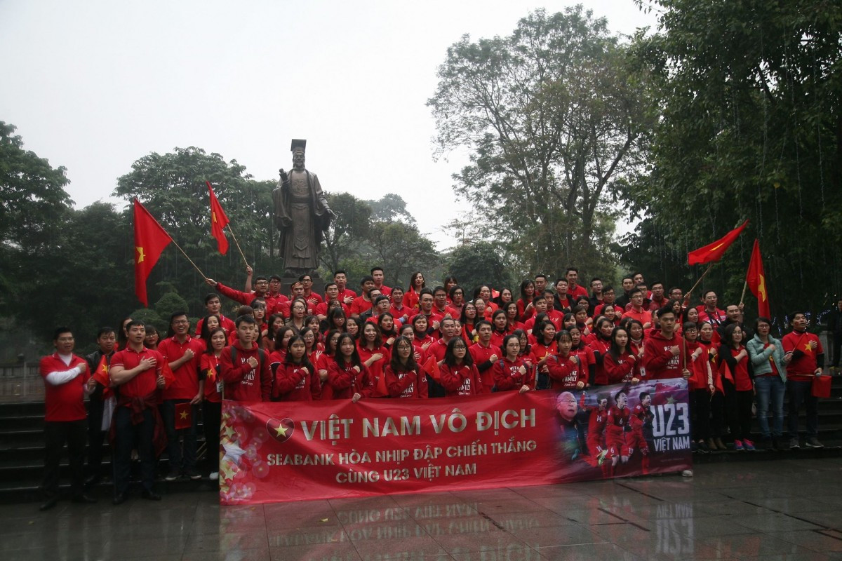 Đầu giờ chiều 27/1, rất đông các cổ động viên đã có mặt tại Hồ Gươm để chuẩn bị tinh thần cổ vũ cho những cầu thủ của U23 Việt Nam trước trận chung kết giải bóng đá Châu Á.