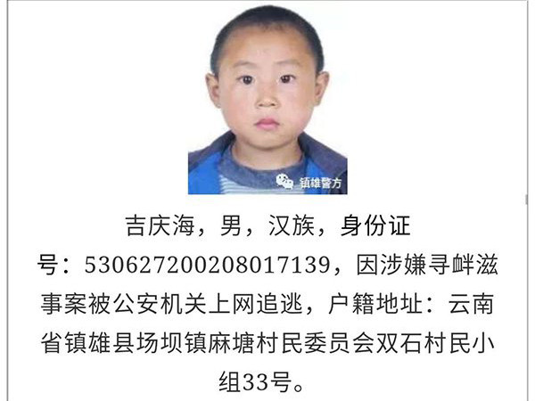 Huyện Zhenxiong đưa thông báo truy nã Ji Qinghai trên trang web của công an huyện vào ngày 19/3 vừa qua. Lệnh truy nã với hình ảnh một học sinh tiểu học này ngay lập tức đã được nhiều người chia sẻ trên mạng xã hội với nhiều bình luận hài hước. Ngay sáng hôm sau, cảnh sát Zhenxiong đã đưa ra một tuyên bố xin lỗi về việc sử dụng bức ảnh thời thơ ấu của nghi phạm mặc dù bây giờ hắn đã trưởng thành. Cảnh sát cũng cố gắng giải thích rằng họ không thể tìm thấy bất kỳ bức ảnh nào về nghi phạm trong thời gian gần đây và hy vọng rằng các đặc điểm trên khuôn mặt của hắn từ khi còn là một đứa trẻ vẫn có thể giúp mọi người nhận ra được nghi phạm khi trưởng thành.