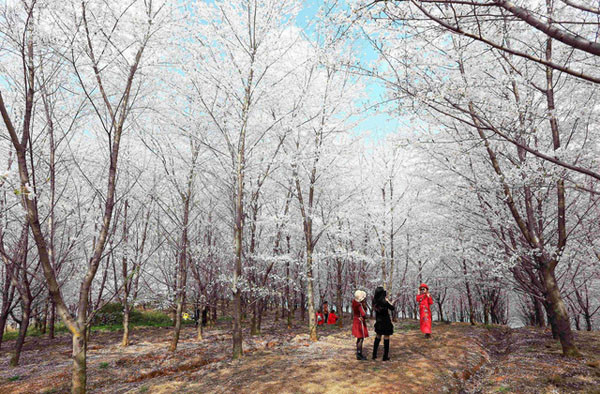 Lượng lớn các cây hoa anh đào được trồng tại đây. Bởi vậy cứ vào mùa hoa, tất cả cùng bung nở khoe sắc, biến nơi này thành “chốn bồng lai tiên cảnh” giữa đời thực. Đây cũng là dịp cao điểm trong năm Quý Châu đón lượng lớn du khách về thưởng hoa.