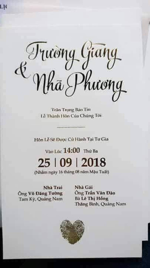 Chi tiết tấm thiệp cưới bị rò rỉ của Trường Giang - Nhã Phương.