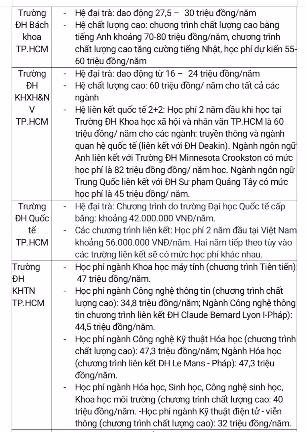 | Tổng hợp mức học phí mới của các trường ĐH công lập phía Nam năm 2022. Nguồn: Internet |