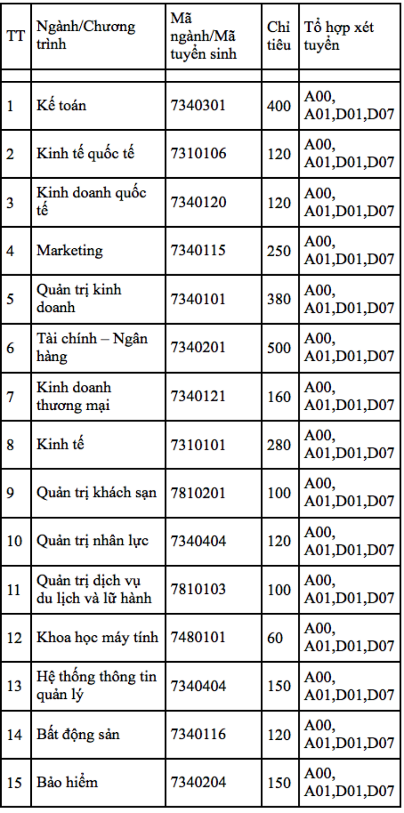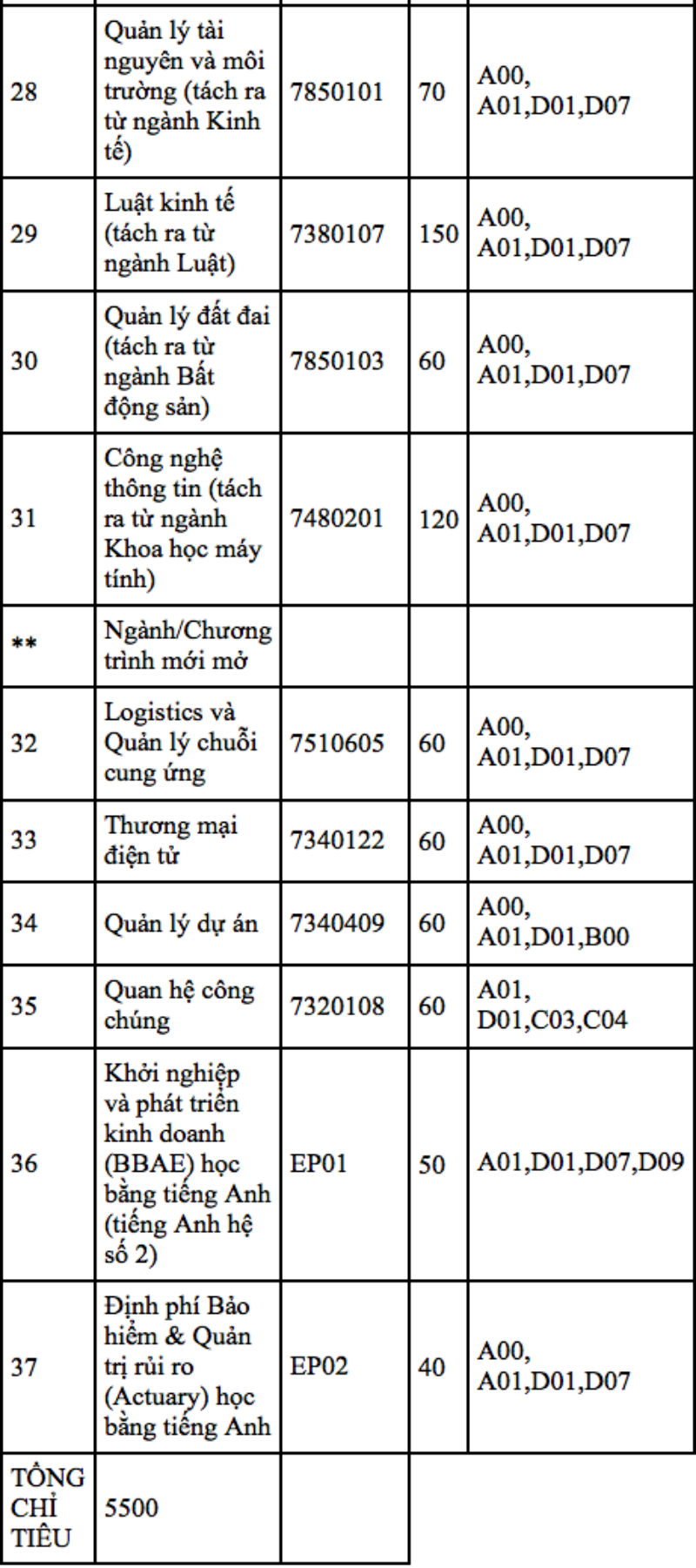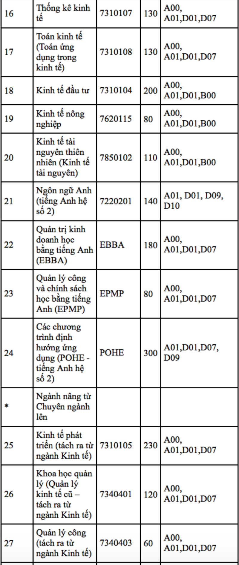 Ngành/ chương trình, mã ngành/ mã tuyển sinh, chỉ tiêu và tổ hợp xét tuyển của ĐH Kinh tế quốc dân năm 2018 như sau: