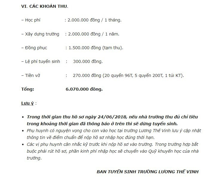 Thông báo của trường THCS & THPT Lương Thế Vinh về các khoản phí. Trong thông báo có nêu rõ: "Trường hợp bắt buộc phải rút hồ sơ, phần kinh phí nhập học sẽ chuyển vào Quỹ khuyến học của nhà trường."