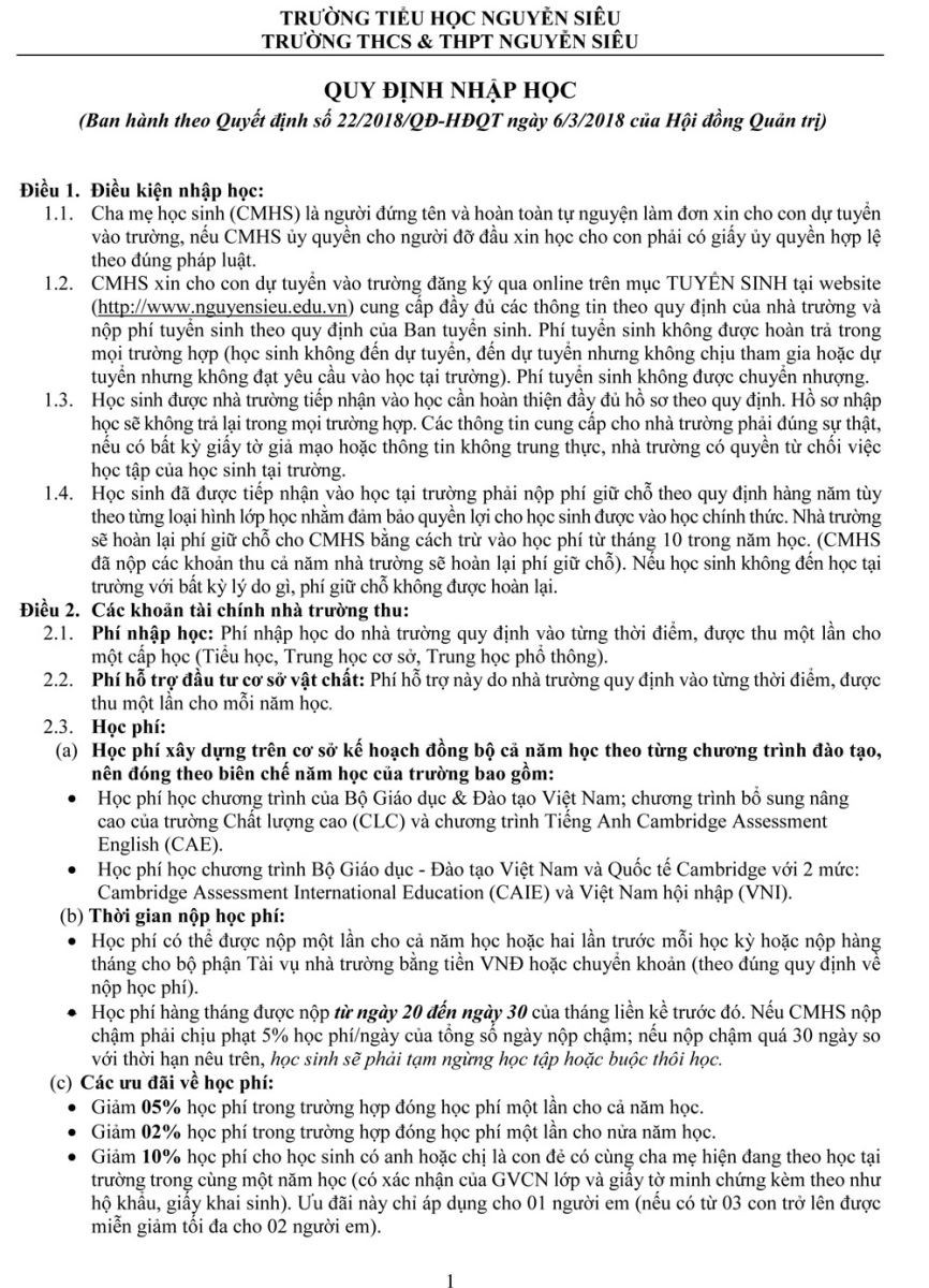 Trong thông báo của trường Tiểu học - THCS - THPT Nguyễn Siêu có nêu: "Nếu học sinh không tới trường học với bất cứ lý do gì, phí giữ chỗ không được hoàn lại."