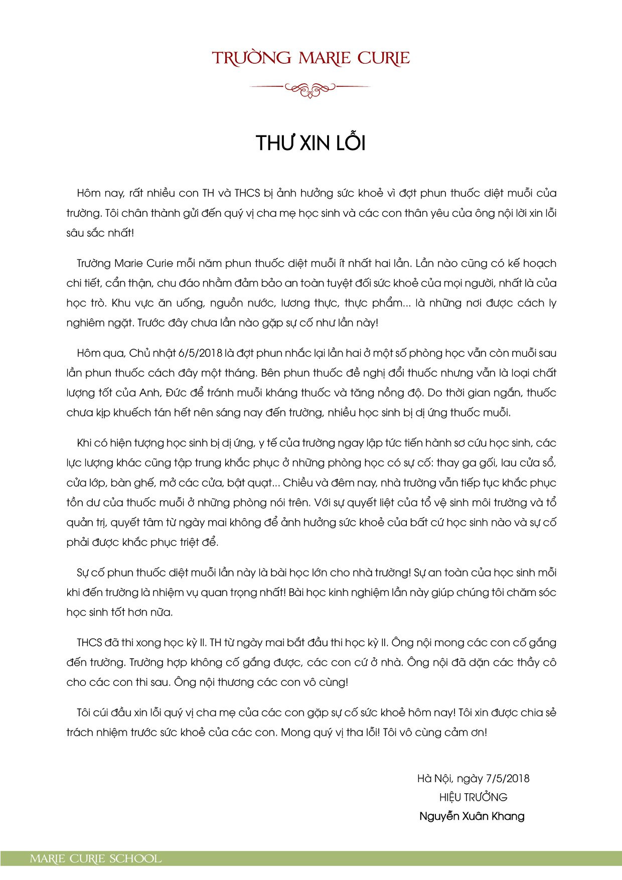 Liên quan đến vụ việc nhiều học sinh ở trường Tiểu học Marie Curie (Hà Nội), thầy Nguyễn Xuân Khang – Chủ tịch Hội đồng Quản trị nhà trường cho biết: “Trường Marie Curie mỗi năm phun thuốc diệt muỗi 2 lần, lần nào cũng lên kế hoạch chi tiết để đảm bảo sức khỏe cho học sinh. Khu vực ăn uống, lương thực, nguồn nước được cách ly nghiêm ngặt và từ trước đó đến nay chưa lần nào gặp sự cố.