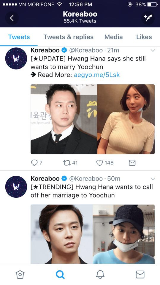 Tiếp theo Naver, đến lượt Koreaboo - một trang thông tin lớn và rất quen thuộc với cộng đồng fan K-biz cũng đăng tải thông tin về việc này. Đầu tiên, tương tự Naver, Koreaboo dẫn lại lời của một người được cho là bạn thân của Park Yoochun và Hwang Hana, và người bạn đó nói rằng Hana muốn chia tay Yoochun. Lý do cũng tượng tự như Naver đã đăng: Vì áp lực bởi những tin đồn bủa vây khiến Hwang Hana rất mệt mỏi, chưa kể chúng còn gây phiền toái cho gia đình cô. Tuy nhiên, người bạn này không xác nhận việc đám cưới có được diễn ra hay không, mà chỉ nói rằng gia đình và bạn bè vẫn đang ủng hộ và giúp đỡ cả hai vượt qua những khó khăn hiện tại.