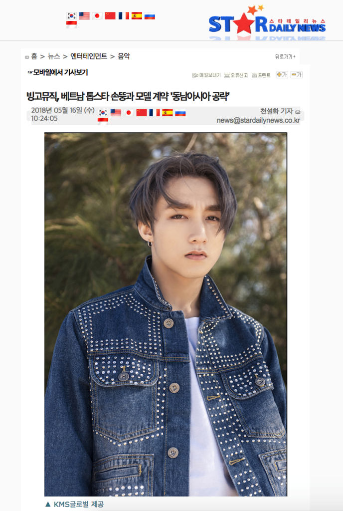 Ngày 16/5, nhiều trang báo xứ Hàn như CcDailyNews, Stardailynews, Sportsseoul... đã đồng loạt chia sẻ thông tin về Sơn Tùng M-TP sẽ ký hợp tác cùng một công ty âm nhạc đình đám Hàn Quốc là Bingo Music.