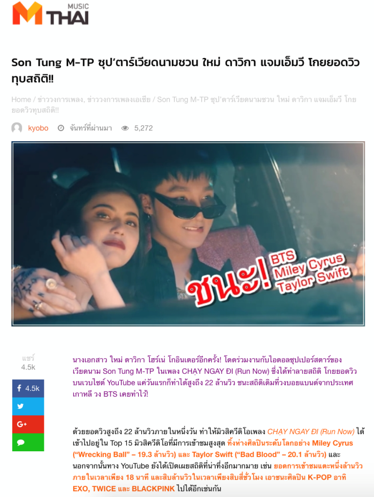 Trong đó, tờ Music Mthai rất bất ngờ về độ "khủng" của MV Chạy ngay đi, khẳng định rằng MV này đã vượt qua thành tích của các nhóm nhạc nổi tiếng như Black Pink, EXO, TWICE. Ngoài ra, tờ báo này còn dành hẳn một bài báo khác để nói về Sơn Tùng và gọi anh là "siêu sao của Việt Nam".