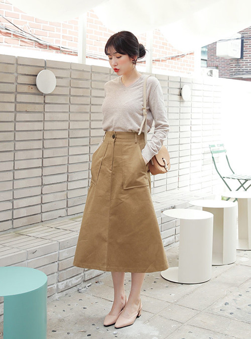 Nếu sợ chân váy ngắn có thể khiến bạn "rét run" khi gió mùa về, chân váy dài quá gối là lựa chọn lý tưởng. Thiết kế chữ A cạp cao tạo cảm giác eo bé hơn, người cao hơn. Lưu ý đừng nên chọn váy quá dài, tầm vừa quá gối chạm bắp chân là hợp lý nhất.