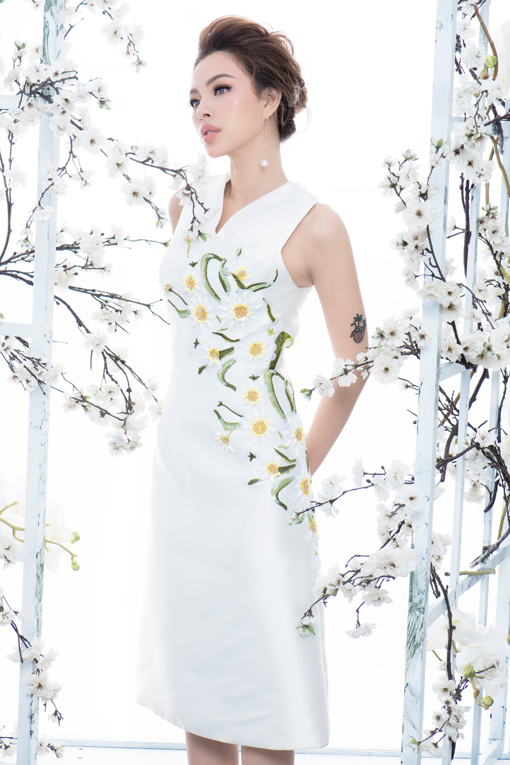 Thiết kế này mang đậm màu sắc của mùa Thu với tông trắng sáng, nhấn nhá bằng họa tiết hoa vàng. Sự hòa quyện của hai sắc độ này hoàn toàn tôn lên được làn da trắng sáng của người đẹp.