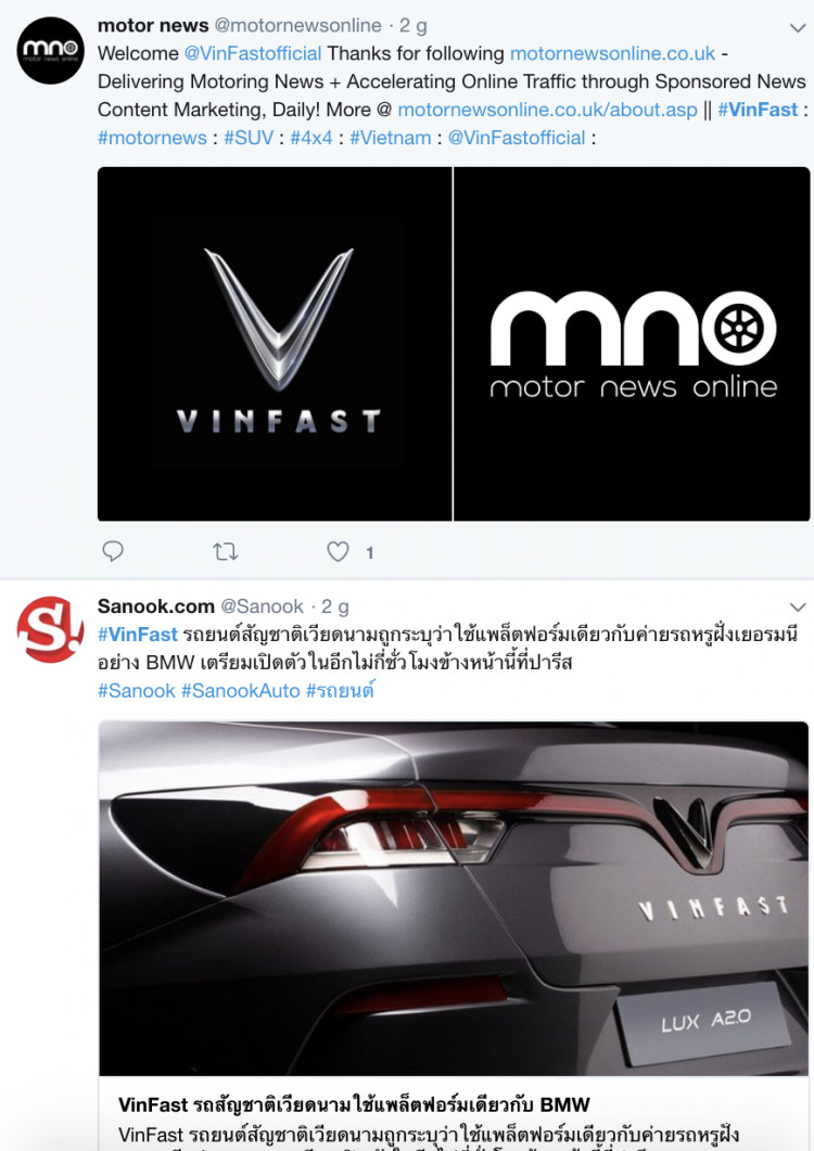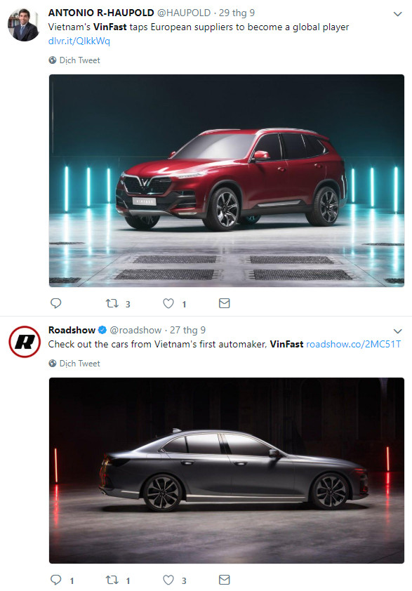 Nhiều trang báo chuyên về xe tại phương Tây cũng đã đăng tải những tweet về VinFast, theo họ, làng ô tô thế giới giờ đây sẽ có nhiều thay đổi khi có mặt một hãng xe Việt Nam. Những quan tâm về giá thành sản phẩm cũng khiến VinFast trở thành từ khoá hot nhất Twitter hiện nay.