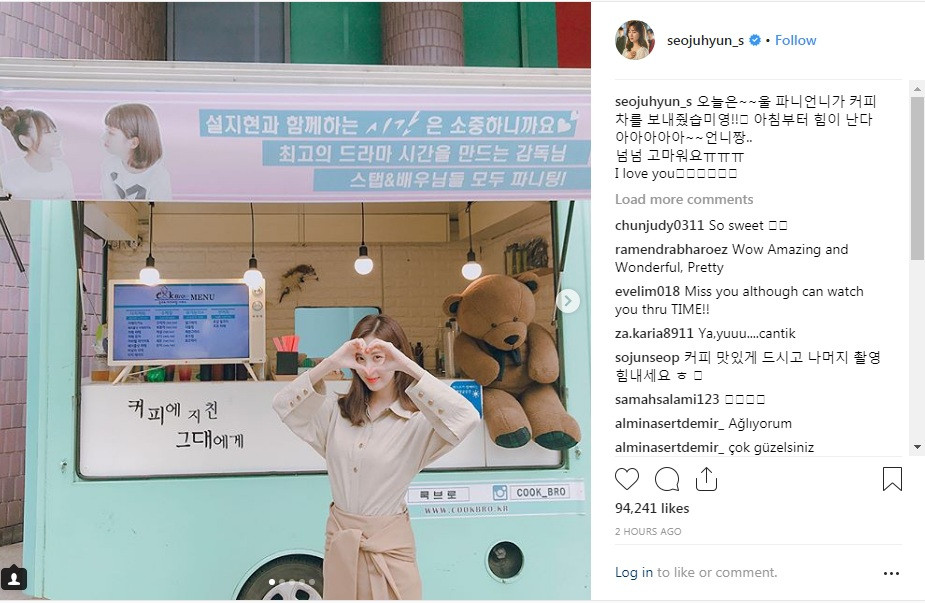 Mới đây, Seohyun vừa mới đăng tải trên Instagram tấm ảnh cô nàng đang đứng trước một xe tải đầy ắp đồ ăn. Tấm banner treo trên xe có ghi dòng chữ lớn “Bởi vì thời gian được ở cùng Seol Ji Hyun (tên nhân vật của Seohyun trong phim Time) rất quý giá. Nên mọi người hãy cố lên nhé”. Điều thú vị là thay vì chữ “fighting” thường thấy, thì tấm banner lại viết thành Fany-ting.