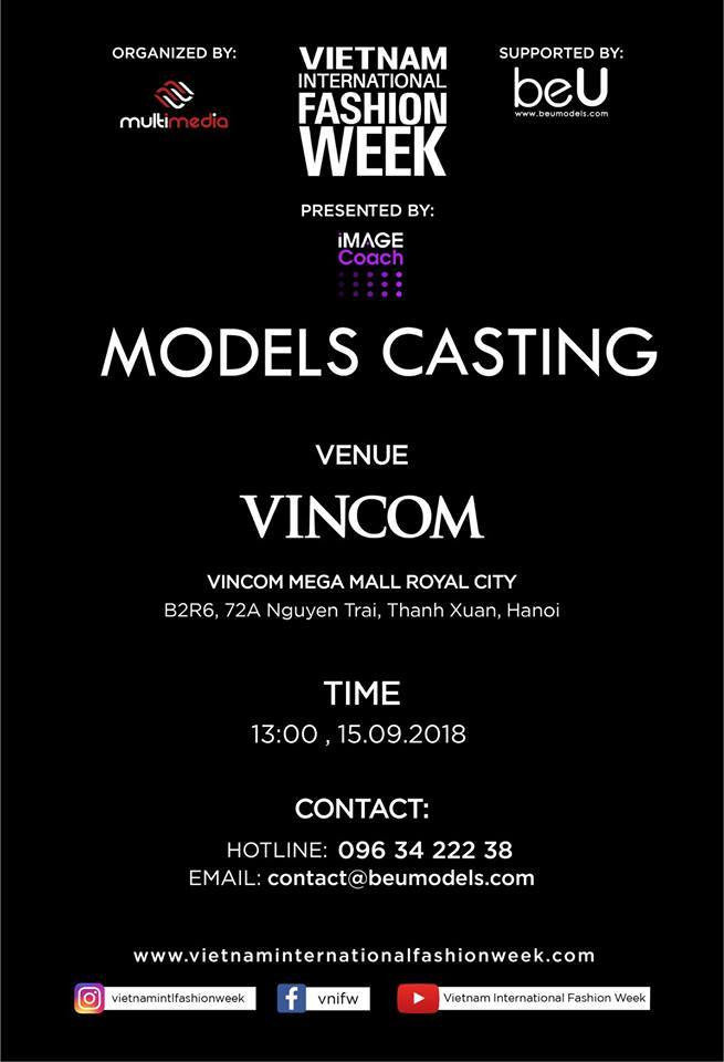 Vòng casting cho sự kiện Tuần lễ thời trang Quốc tế Việt Nam Thu Đông 2018 sẽ được diễn ra tại Hà Nội vào ngày 15/9 tại Vincom Mega Mall Royal City, Hà Nội. Chương trình chào đón tất cả người mẫu chuyên nghiệp và không chuyên. Đối với những người mẫu đến từ những khu vực khác không thể giam gia vòng casting tại Hà Nội vẫn còn cơ hội để tham gia trình diễn tại VIFW FW 2018, bằng cách gửi hồ sơ online từ hôm nay đến hết ngày 20/9/2018. Hồ sơ gửi về: