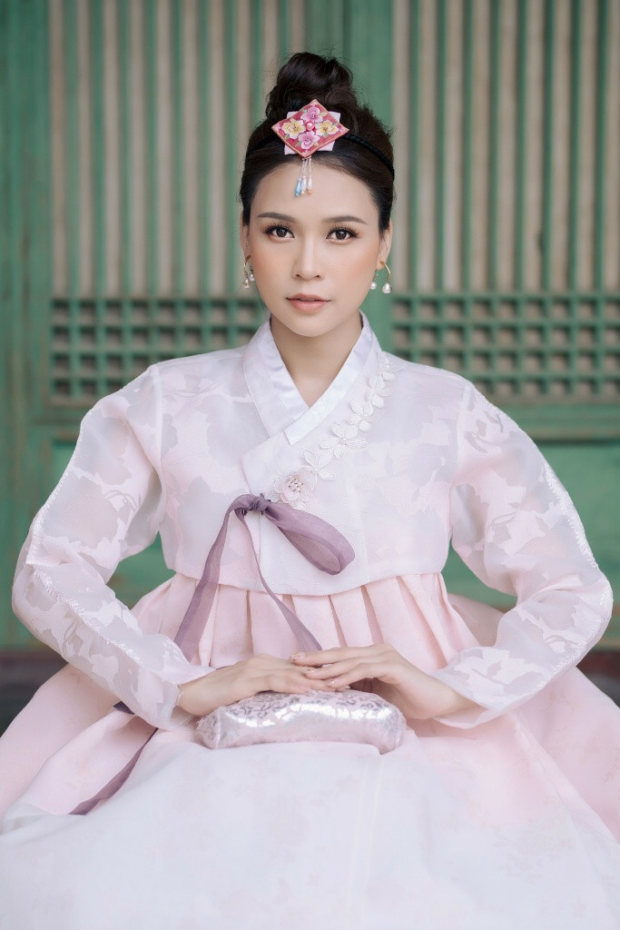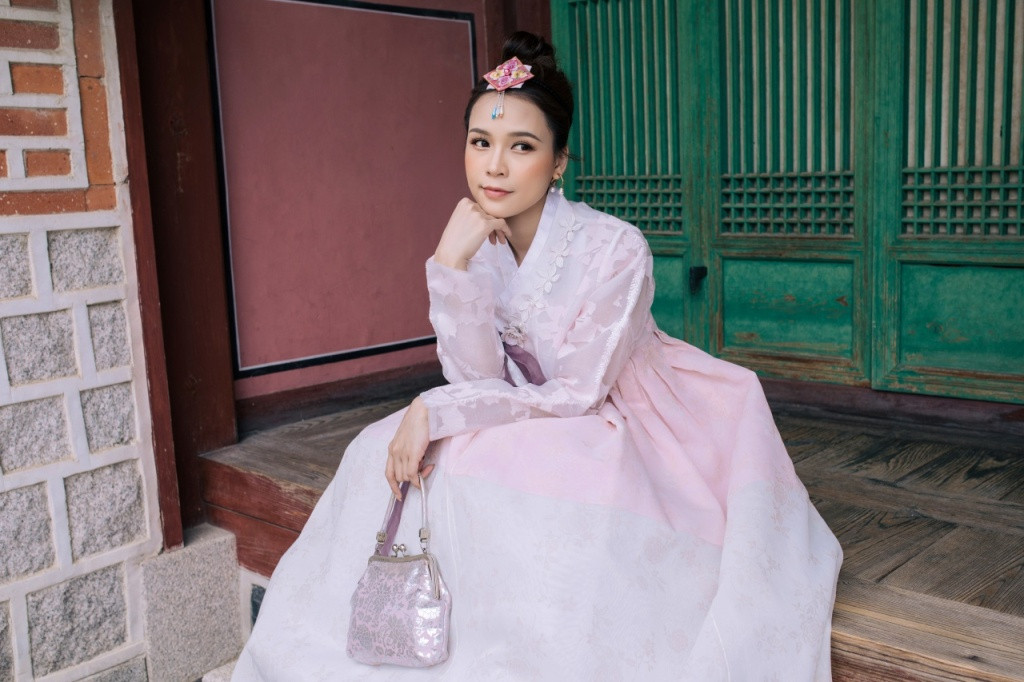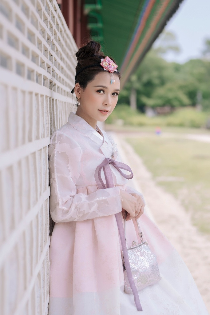 Khoác lên mình bộ áo có màu sắc nhã nhặn, Sam khéo léo chọn tông trang điểm trong trẻo. Nữ diễn viên tạo cảm giác cô như thiếu nữ bước ra từ những bộ phim cung đấu xứ Hàn.