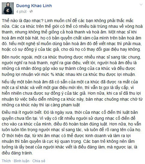 Không những thế, Dương Khắc Linh đã từng có một bài viết trên trang cá nhân của mình, thể hiện rõ quan điểm của anh về vấn đề đạo nhạc cách đây 4 năm. Dương Khắc Linh viết: