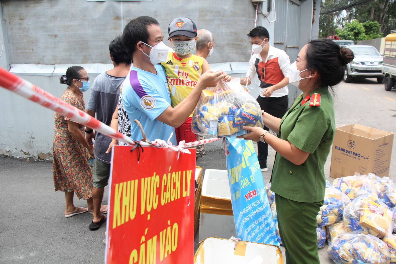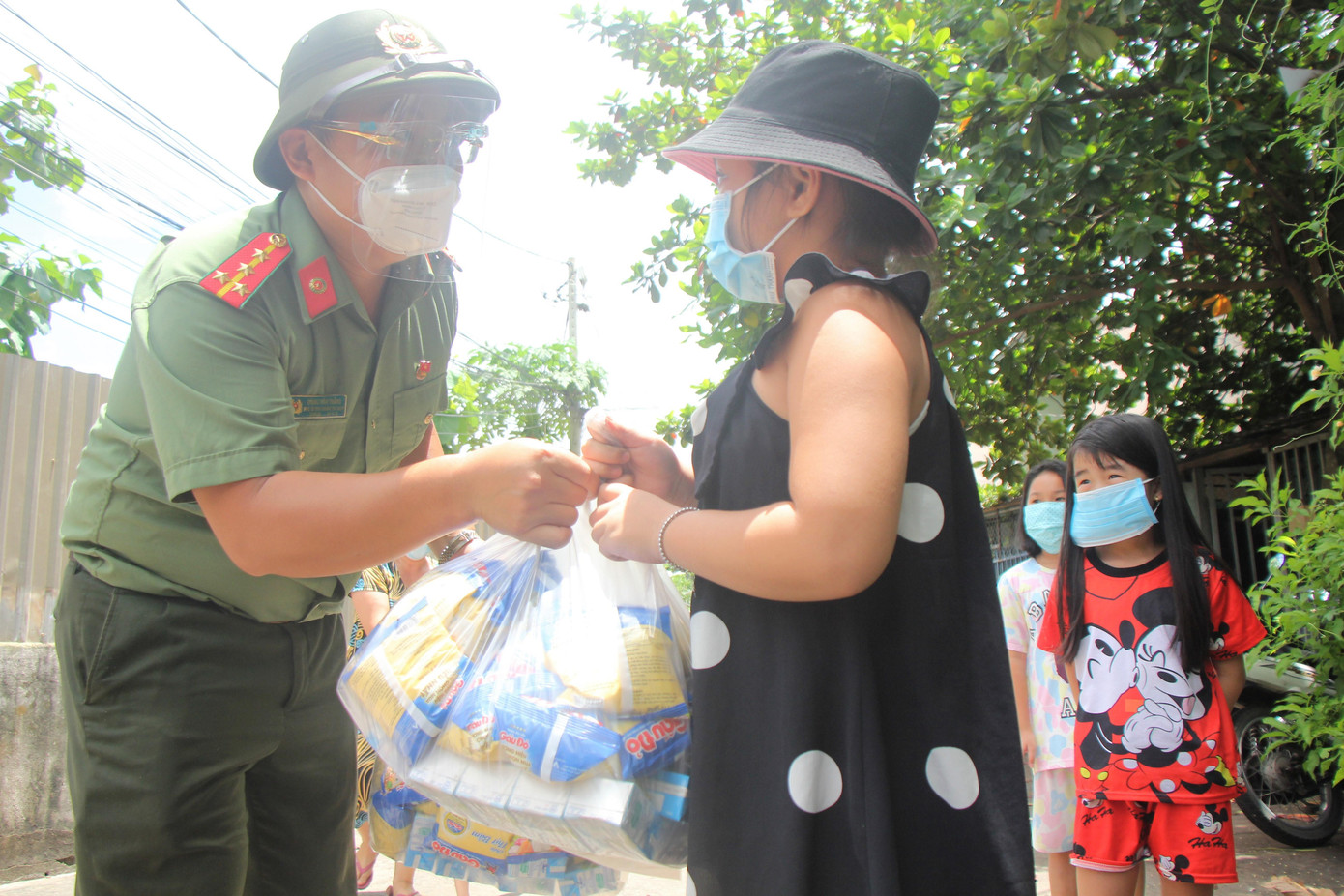 | Cán bộ, chiến sỹ Công an TPHCM mang nhu yếu phẩm đến tặng ở một số khu dân cư có các trẻ mồ côi, khuyết tật. |