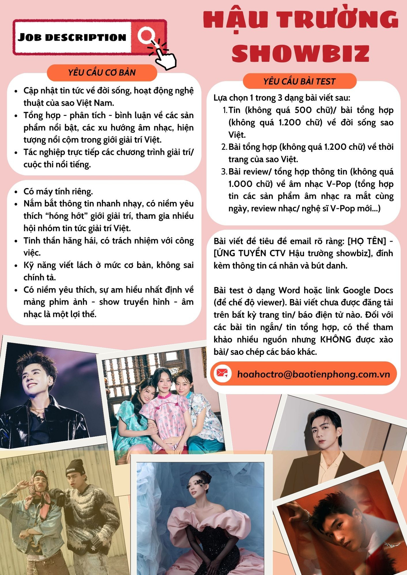 Nơi "hẹn hò" lý tưởng của những bạn trẻ thích xem phim, nghe nhạc, "cày" gameshow. Dĩ nhiên, những ai mê "hóng hớt" chuyện ngôi sao sẽ là một mảnh ghép không thể thiếu của mục này. Nếu bạn muốn "đặt một chân"... vào showbiz Việt, hộp thư nhà Hoa đang chờ đợi các bài viết tin/ tổng hợp/ phân tích - bình luận về âm nhạc, phim ảnh, gameshow và đời sống sao Việt.