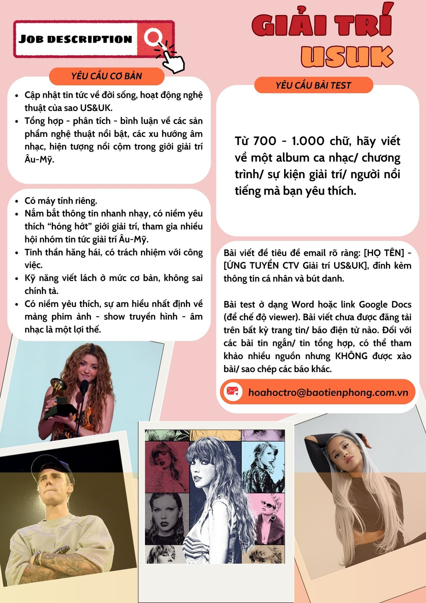 Với những bạn "trót trao tim" cho nền giải trí US&UK, đừng ngại kể về một nghệ sĩ US&UK hoặc một bộ phim, album hay MV vừa ra mắt mà bạn yêu thích (tối đa 700 chữ).