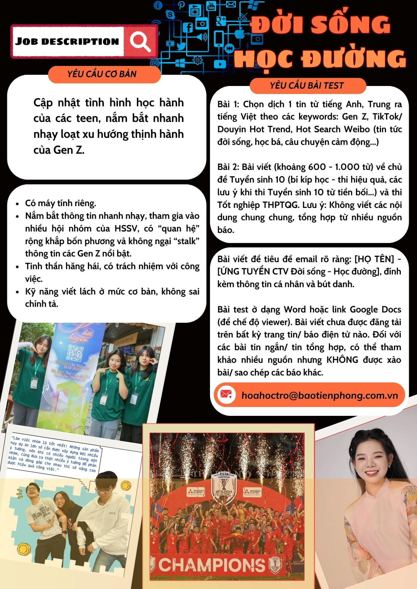 Trở thành một thành viên "cạ cứng" của team Đời sống - Học đường, bạn cần thực hiện 1 trong 2 bài viết: Chia sẻ những sự kiện, hoạt động hay ho về học đường hoặc cập nhật những trend đang hot trong "cột sống" Gen Z.