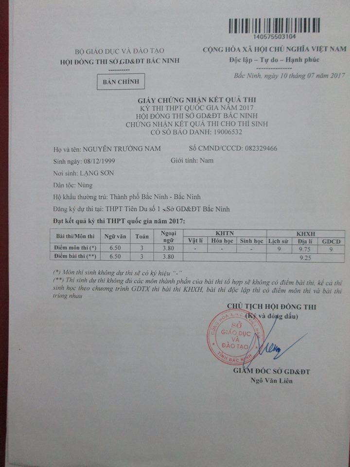 Giấy chứng nhận kết quả thi THPT Quốc gia của thí sinh Nguyễn Trường Nam.