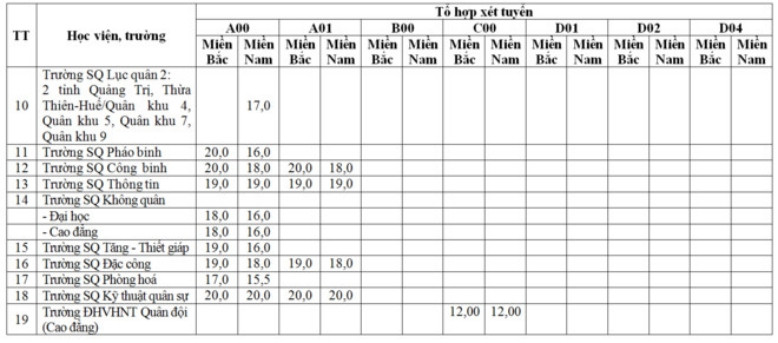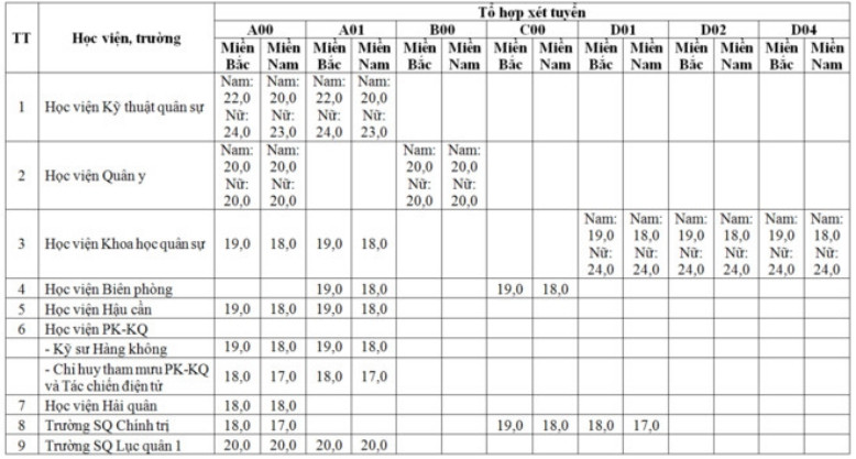 Điểm nhận hồ sơ xét tuyển vào 19 trường Đại học quân đội cụ thể như sau: