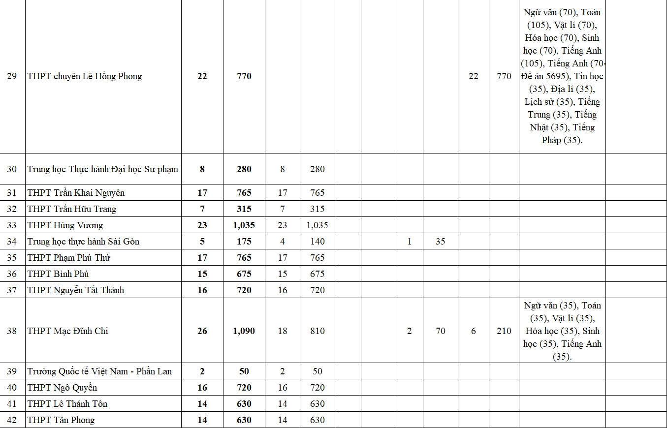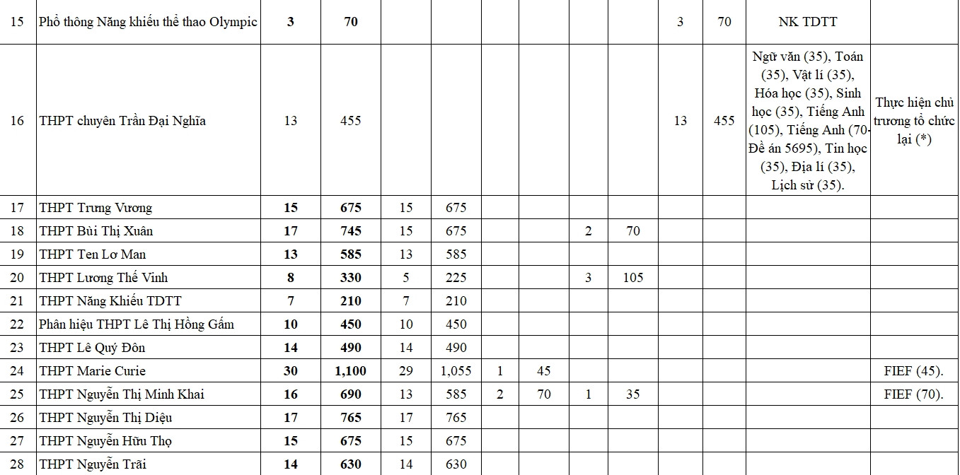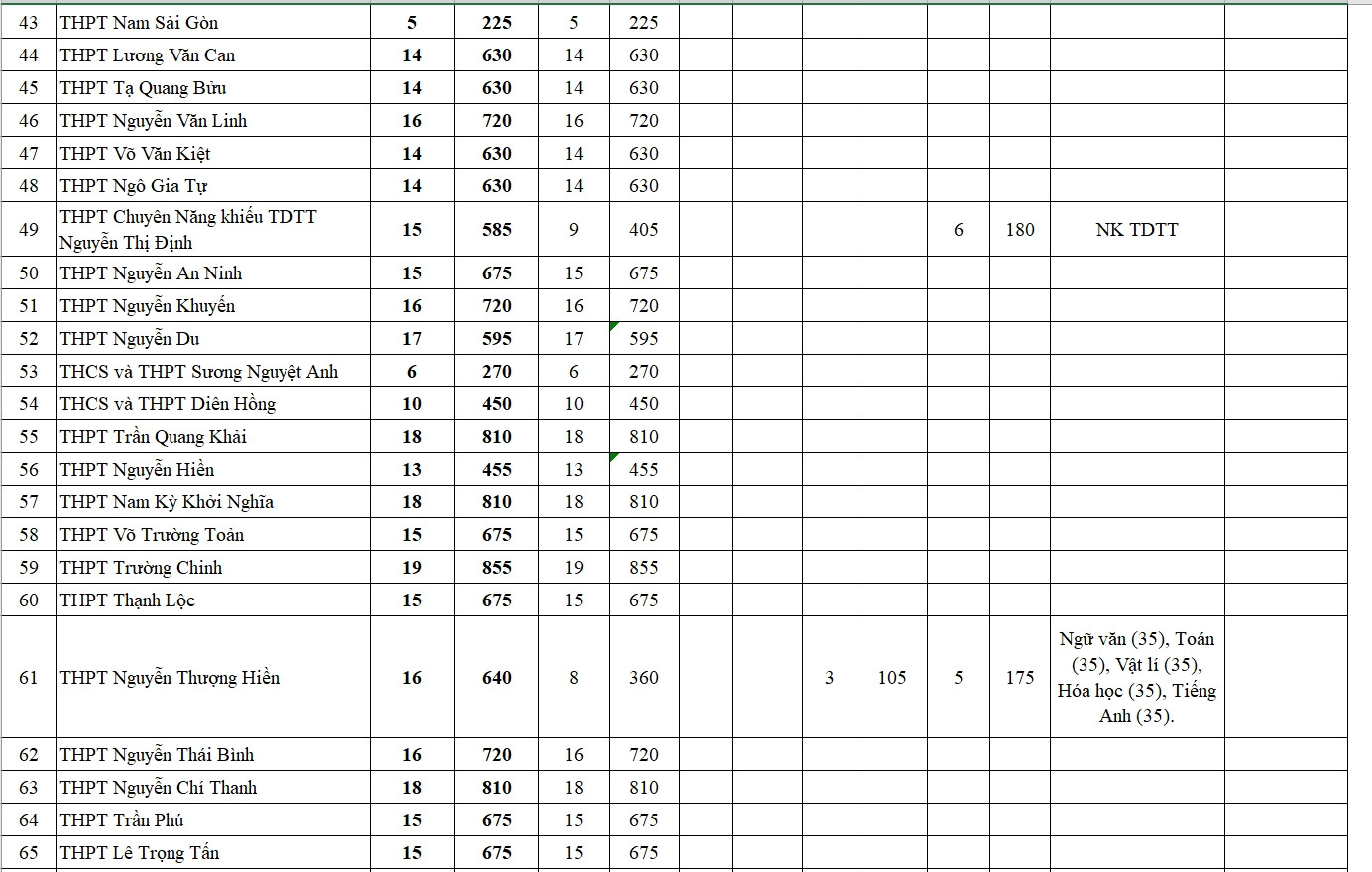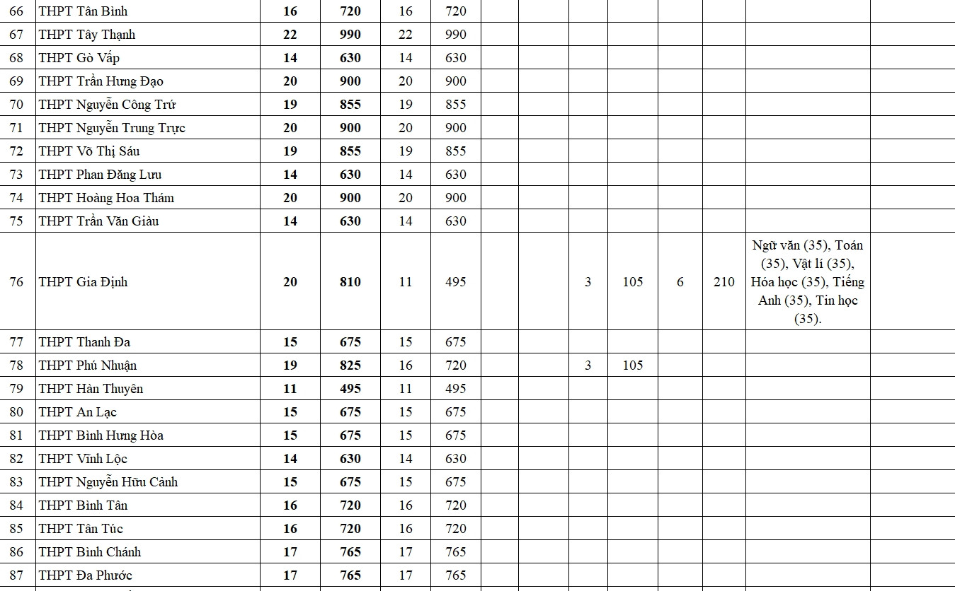 Trường THPT Trần Phú giảm mạnh nhất với 270 chỉ tiêu; THPT Lê Quý Đôn giảm 185 chỉ tiêu; THPT Gia Định giảm 135 chỉ tiêu, THPT Nguyễn Thượng Hiền, THPT Nguyễn Hữu Huân, THPT Phú Nhuận cùng giảm 90 chỉ tiêu; THPT Nguyễn Thị Minh Khai và THPT Nguyễn Hữu Cầu giảm 45 chỉ tiêu.