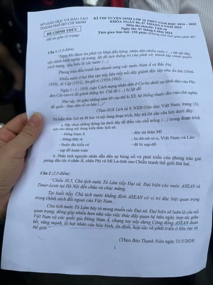 | Đề chuyên Sử chính thức. Ảnh: Khúc Mùa Thu |