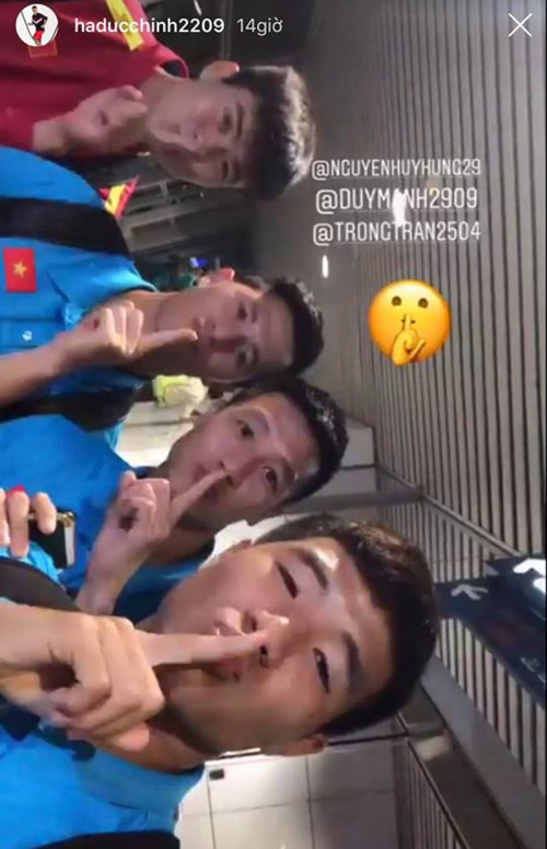 Mới đây, fan phát hiện tuyển Việt Nam có một cách pose hình rất "đặc biệt". Trong nhiều bức ảnh được đăng tải, các cầu thủ đều có hành động giơ ngón trỏ lên che miệng giống biểu cảm "suỵt" khi nói chuyện. Tiến Dũng, Đức Chinh, Hồng Duy, Đình Trọng, Huy Hùng... đã cùng lăng xê biểu cảm này khiến fan thích thú.