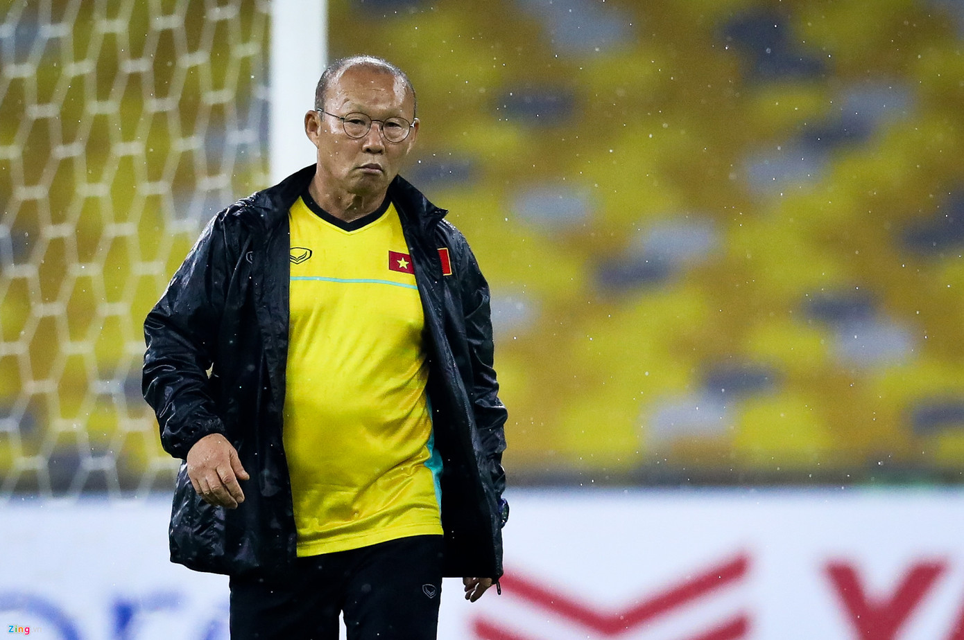HLV Park Hang-seo bước đi trong mưa trước buổi tập cuối cùng của đội tuyển Việt Nam. Sau trận chung kết U23 châu Á ở Thường Châu (Trung Quốc), ông Park và các học trò mới lại có mặt tại một trận tranh ngôi vô địch.