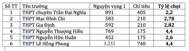 Cụ thể, tỷ lệ chọi vào lớp 10 chuyên ở các trường tại TP.HCM dựa theo đăng ký nguyện vọng 1 như sau (tỷ lệ được làm tròn):