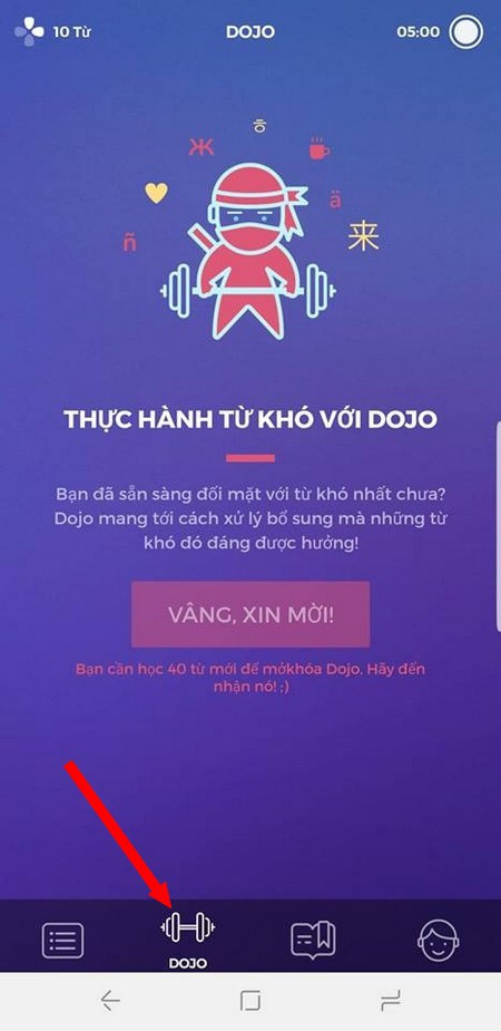 Với những người dùng đã có vốn tiếng Anh (hoặc ngoại ngữ bất kỳ) cơ bản và muốn khám phá thêm những từ mới khó hơn, Drops cũng cho phép người dùng thực hiện điều này. Bạn nhấn vào biểu tượng quả tạ ở menu bên dưới ứng dụng để kích hoạt chế độ học từ khó. Tuy nhiên để kích hoạt chế độ này, đầu tiên bạn phải học được ít nhất 40 từ mới ở chế độ thông thường trên ứng dụng Drops.