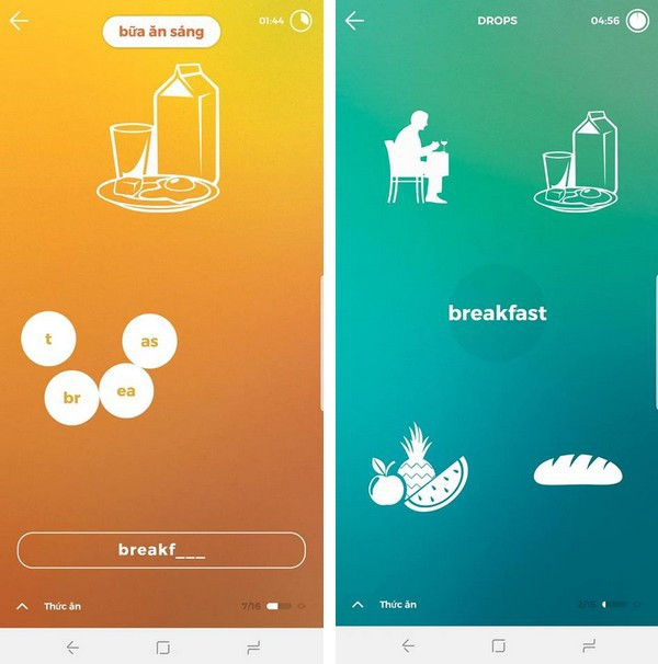 Drops sẽ đưa ra những hình thức vừa học vừa chơi để người dùng có thể ghi nhớ các từ mới, bao gồm việc ghép từ với hình ảnh minh họa cho chính xác, ghép nối các chữ với nhau để thành từ hoàn chỉnh... điều này giúp người dùng không chỉ nhớ được từ mới mà còn nhớ được cách viết của các từ mới.