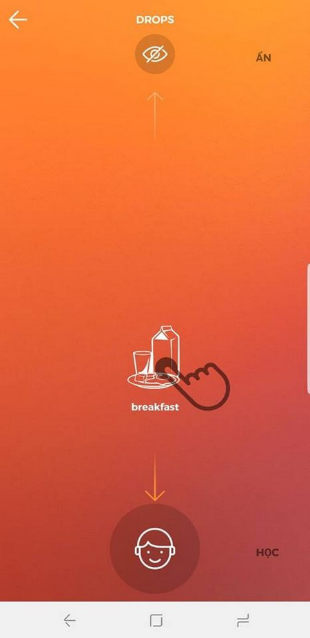 Đầu tiên Drops sẽ giới thiệu từng từ mới bằng tiếng Anh, rồi giải nghĩa bằng tiếng Việt, kèm theo đó là hình ảnh minh họa của từ để người dùng dễ ghi nhớ hơn. Nếu bạn đã ghi nhớ được từ mới, kéo từ xuống phía dưới để lưu lại từ đã học, hoặc kéo lên trên để bỏ qua từ và học một từ mới khác.