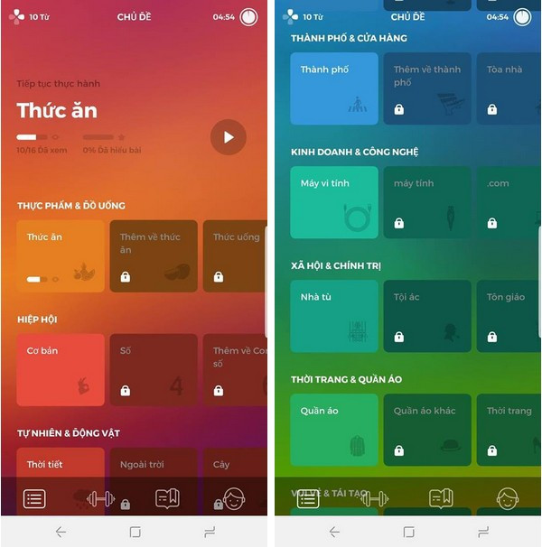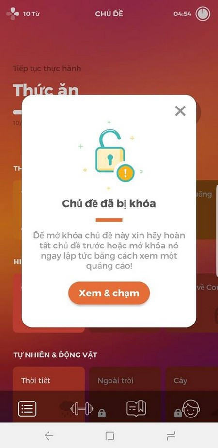 Bạn nhấn vào nhóm từ mà mình muốn học, sau đó chọn “Xem & Chạm” để xem một đoạn video quảng cáo nhằm mở khóa nhóm từ mới đang bị khóa này.