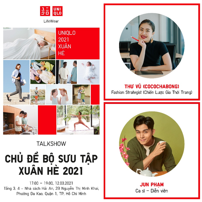 Buổi Talk show với những chia sẻ thú vị cùng các bí quyết phối trang phục từ Ca sĩ, Diễn viên Jun Phạm và Fashion Stategist (Chiến lược gia thời trang) Thư Vũ sẽ giúp người tham dự có thêm những gợi ý hữu ích để làm mới phong cách cá nhân với các thiết kế từ BST LifeWear Xuân/Hè 2021 mới nhất dựa theo nhiều khía cạnh khác nhau: Neighborhood Life (Trang Phục Đa Phong Cách), Wellness Life (Trang Phục Vận Động), New Work Life (Trang Phục Công Sở), và Home Life (Trang Phục Mặc Nhà).