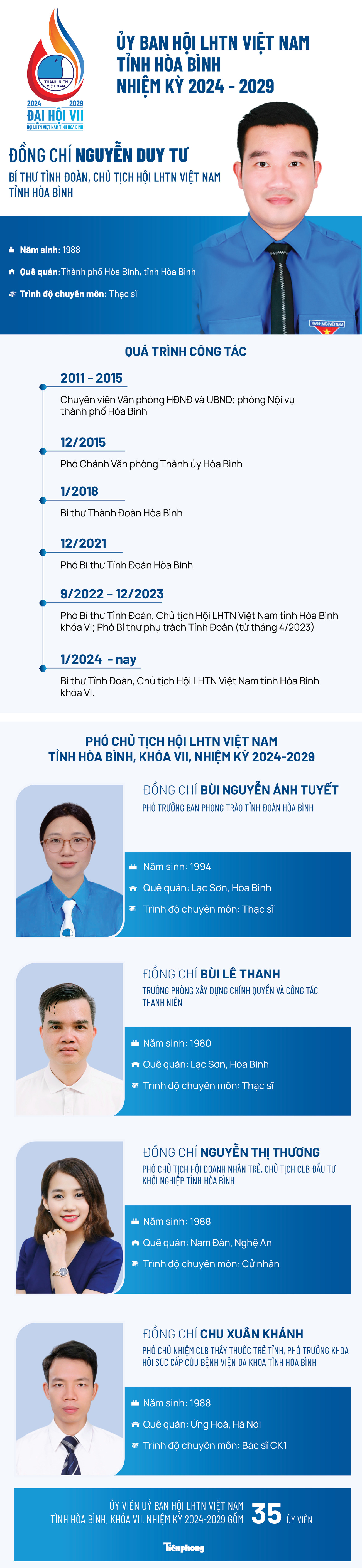 TPO - Đại hội đại biểu Hội LHTN Việt Nam tỉnh Hòa Bình lần thứ VII, nhiệm kỳ 2024 - 2029 đã hiệp thương chọn cử 35 anh, chị tham gia Uỷ ban Hội LHTN Việt Nam tỉnh Hòa Bình, nhiệm kỳ 2024 - 2029. Anh Nguyễn Duy Tư – Bí thư Tỉnh Đoàn, Chủ tịch Hội LHTN Việt Nam tỉnh Hòa Bình khoá VI, tiếp tục được tín nhiệm làm Chủ tịch Hội LHTN Việt Nam tỉnh Hòa Bình khoá VII.