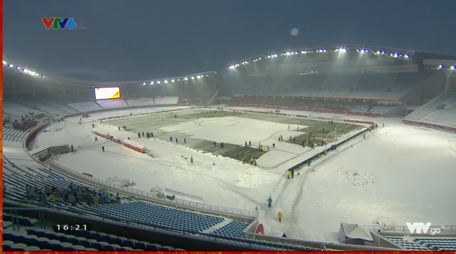 SVĐ Thường Châu ngập trong tuyết, phải dành gần một tiếng đồng hồ để dọn tuyết phục vụ thi đấu.