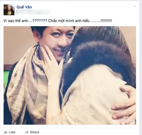 Theo linh tính, 2 ngày sau em mở tivi ra bất ngờ thấy anh và cô ấy cầm tay nhau đến nhận giải Mai Vàng. Lúc đó anh cầm tay cô ấy, anh có thấy xấu hổ và hổ thẹn với em không? Tại sao anh không nói trước với em một lời để em đỡ đau. Em rơi nước mắt vì anh đó” - Quế Vân viết.