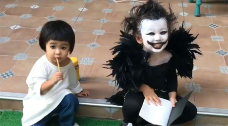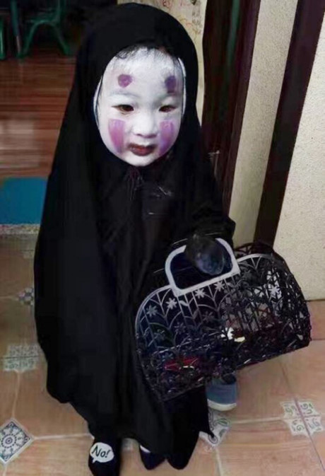 Halloween năm ngoái, cô bé Momo Lu đến từ Đài Loan đã trở nên nổi tiếng trên mạng xã hội vì cosplay Vô Diện trong Spirited Away đến lớp. Trong bộ trang phục đen, gương mặt hóa trang trắng bệch, Momo Lu đã làm bạn bè cùng lớp sợ hãi bật khóc trong khi cô bé mặt vẫn rất… tỉnh. Giữa một rừng công chúa, hoàng tử, bà tiên… Momo Lu quá sức nổi bật vì hóa trang độc-lạ. Đã thế cô bé lại còn xách thêm một cái túi đi chợ để xin kẹo, nhìn thôi đã không nhịn được cười.