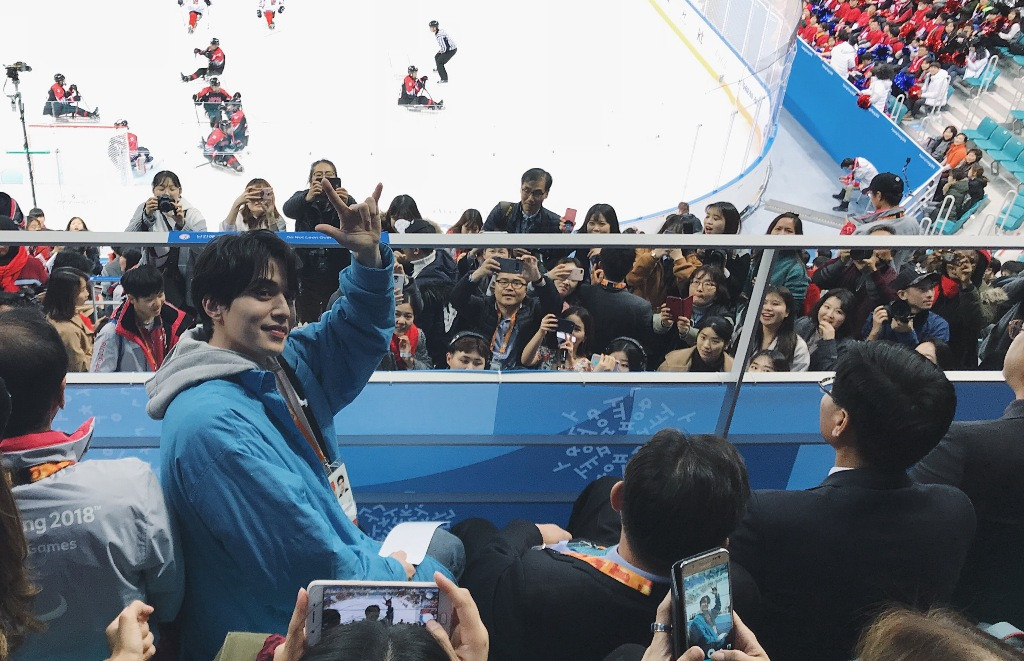 Sau buổi fan meeting kéo dài gần 2 tiếng, hai nghệ sĩ Việt Nam có dịp xem trận đấu khúc quân cầu trên băng giữa hai đội tuyển Paralympic của Nhật Bản và CH Czech. Lee Dong Wook cũng có mặt trên hàng ghế khán giả để cổ vũ cho các vận động viên khuyết tật. Anh liên tục quay xuống chào mọi người ngồi ở hàng ghế phía sau, trong đó có Văn Mai Hương, Bình An. Cả hai đã không giấu được cảm xúc thích thú bởi được nhìn Lee Dong Wook ở khoảng cách gần.