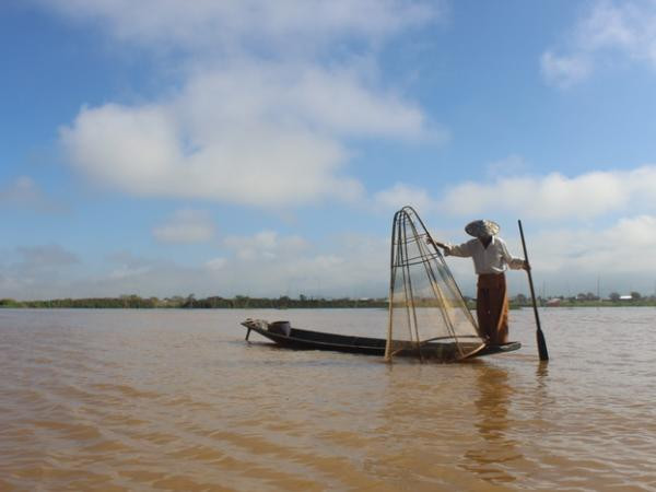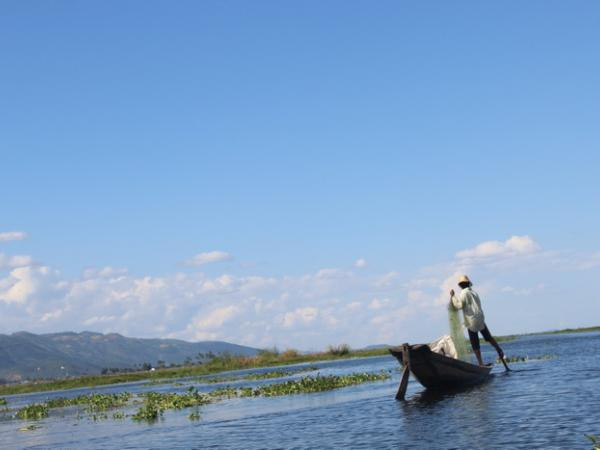Hồ Inle có diện tích 116 km², là hồ nước ngọt lớn thứ nhì Miến Điện. Hồ nằm giữa những ngọn núi và sâu khoảng 2,1 m với điểm sâu nhất 3,7 m vào mùa khô nhưng mùa mưa độ sâu có thể tăng thêm 1,5 m. Thuyền rời làng NyaungShwe chừng 10 phút thì ra đến giữa hồ. Chúng tôi lọt thỏm giữa một vùng sóng nước mênh mang với những dãy núi mờ sương bao phủ đường chân trời. Mây trắng và trời xanh in bóng trên mặt nước; gió thổi mang rượu mang theo không khí tinh sạch của đất trời. Thỉnh thoảng lại có một tiếng cá quẫy đuôi hay một chú hải âu bay vụt qua mũi thuyền. Khung cảnh kỳ vĩ và bình yên nhưng những thước phim về thiên nhiên hoang dã. Ngay cả sự xuất hiện của một người chèo thuyền đơm cá bằng chân theo truyền thống của địa phương cũng lặng lẽ và hài hòa như một phần tất yếu của mặt hồ.