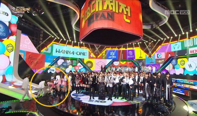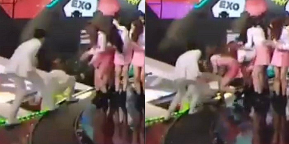 Jeonghan (Seventeen) cứ lùi ra ngoài nhường chỗ cho các idol khác, nên đã bị ngã ra khỏi sân khấu và chắc chắn là rất đau. Nhóm Seventeen cùng các cô gái PRISTIN đứng ngay cạnh đó, đã nhanh chóng chạy ra đỡ Jeonghan lên trong sự lo lắng của mọi người.