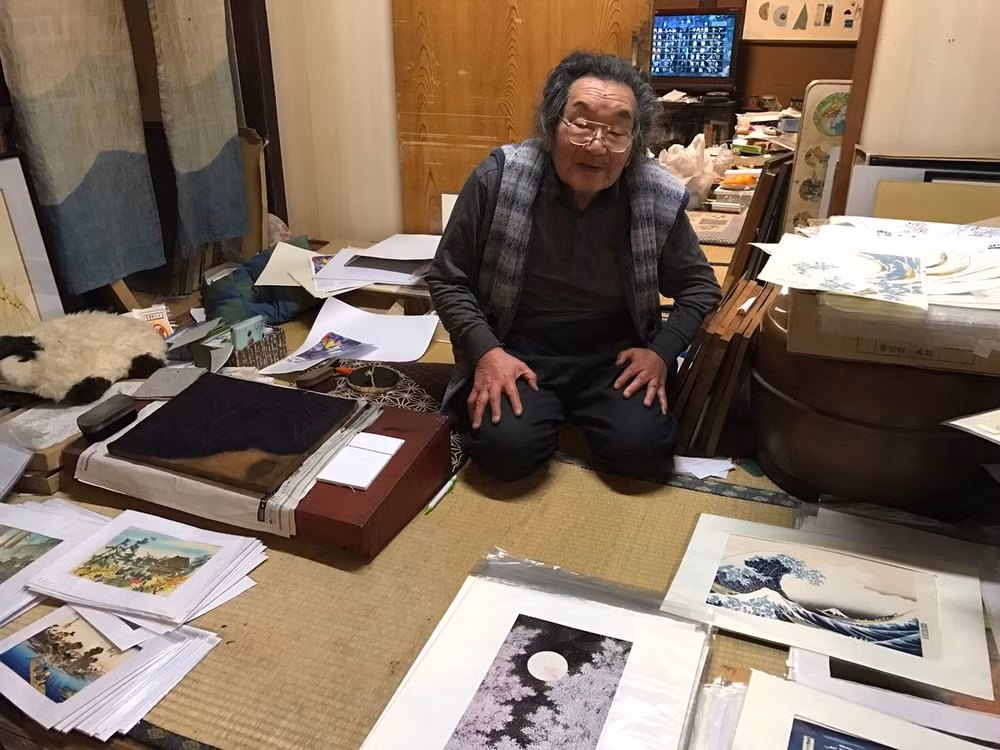Để có được tranh in bản mộc hoàn thiện phải trải qua nhiều giai đoạn và cần có sự tham gia của nhiều nghệ nhân theo từng công đoạn gồm thiết kế bản in, chạm khắc và người thợ in. Nhưng cụ Ihimura thực hiện tất cả ba vai trò trên. Toàn bộ quá trình tốn rất nhiều công sức, nhưng một khi những khối gỗ đã thành hình, những công đoạn cuối cùng khá đơn giản.
