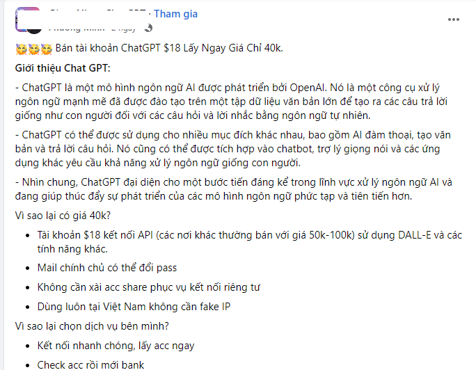 Chia sẻ trên VnExpress, quản trị viên một nhóm về ChatGPT cho biết, dịch vụ mở ChatGPT hiện tại chia làm 4 nhóm chính, tùy thuộc vào tính năng mà có giá thành khác nhau. Loại có giá khoảng 15K là tài khoản được tạo sẵn với tên và mật khẩu không thể thay đổi. Tài khoản này được dùng chung bởi nhiều người nên thường bị quá tải.